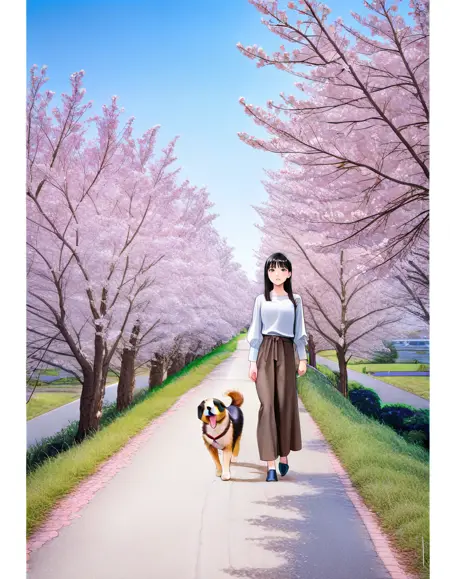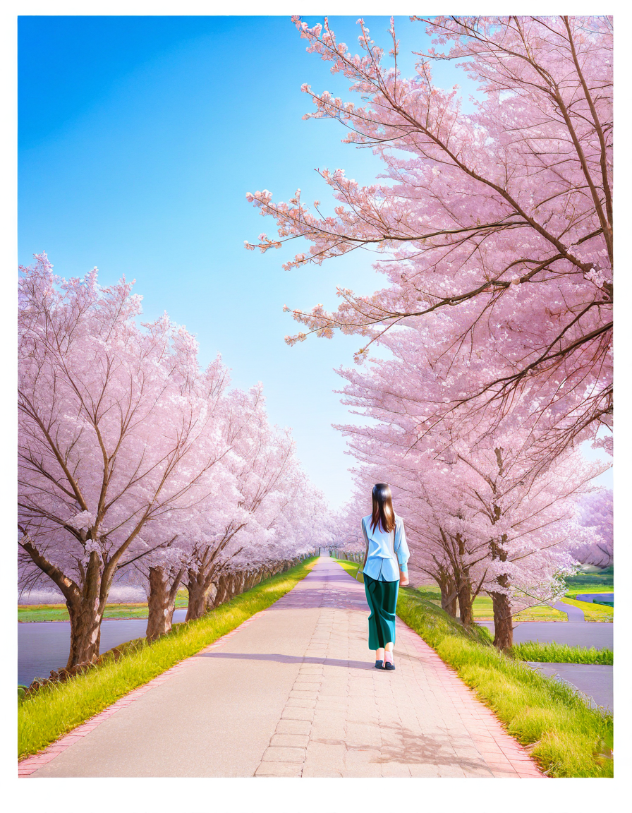 실외, 풍경, 낮, 구름, 하늘, 푸른 하늘, 다리, 강, 물, 도로, 길, 꽃, 나무, 풀, 건물, 벚꽃, 꽃잎, 도시, 도시 풍경, 고층 빌딩, 계단, 울타리, 반사, 표지판,