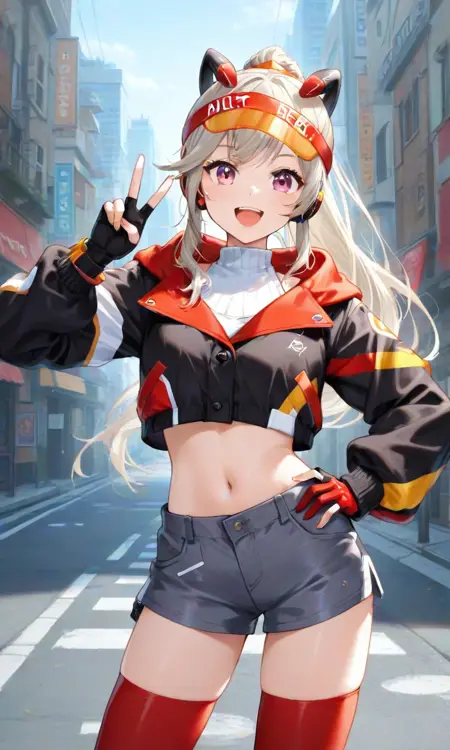 met ponytail, long hair, ponytail, visor cap, black cropped jacket, white crop top, grey shorts, single fingerless glove, red thighhighs🔰Nanashi Inc.軍事衣装: