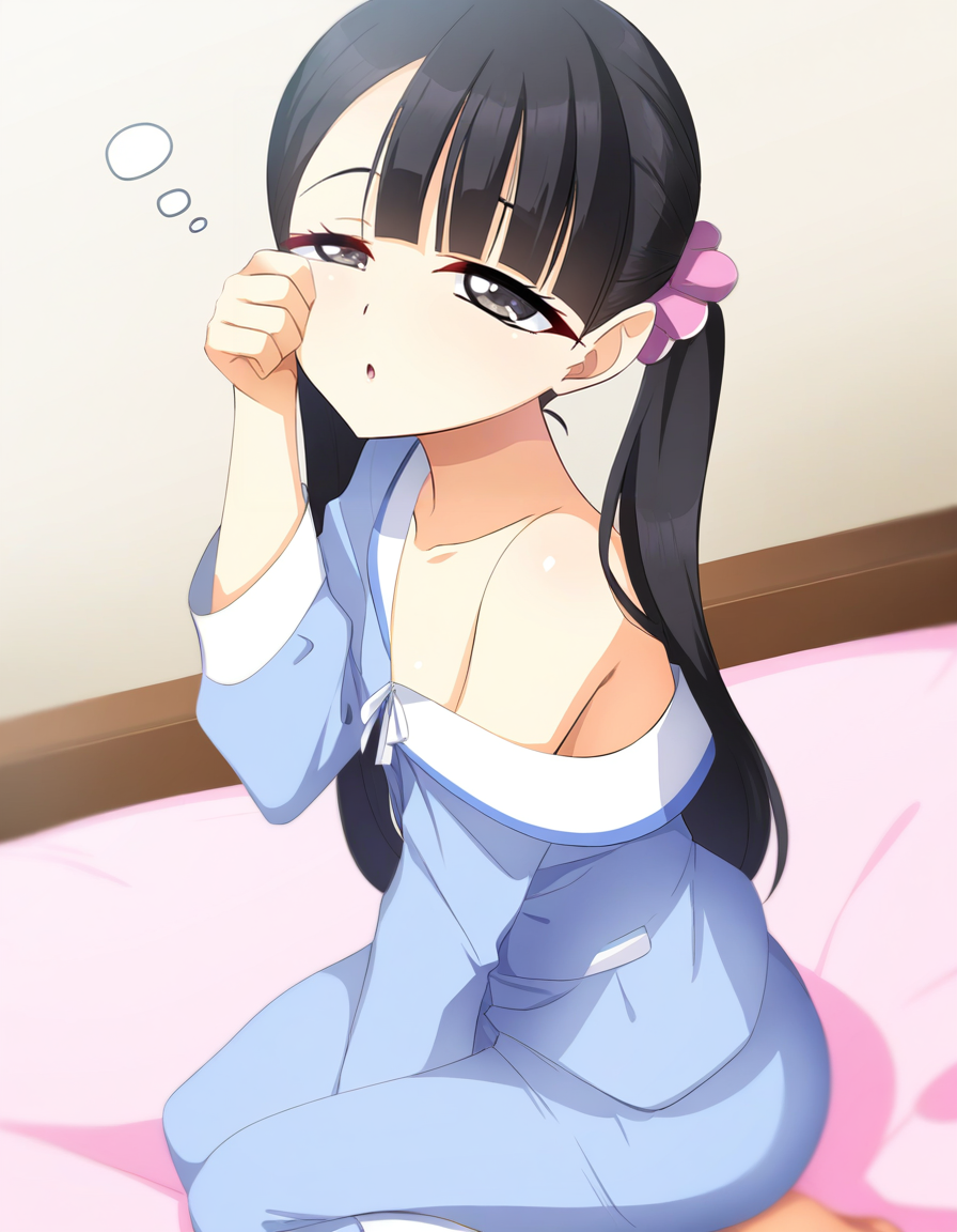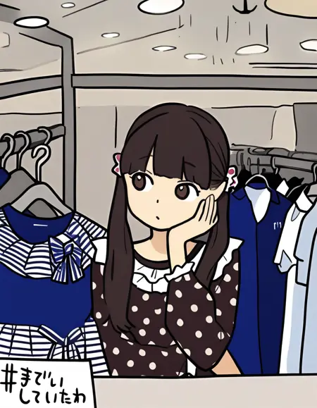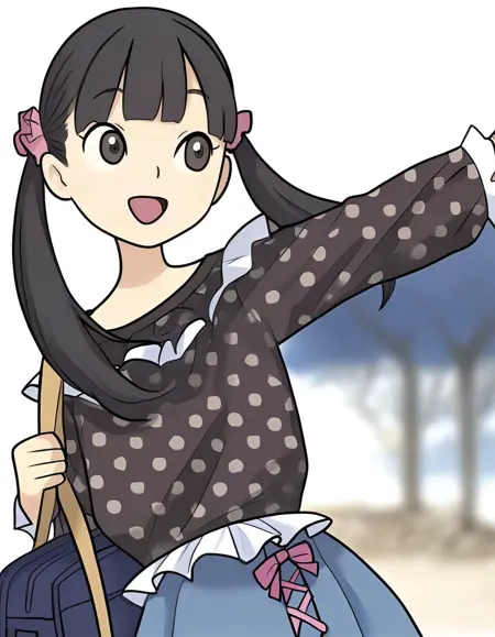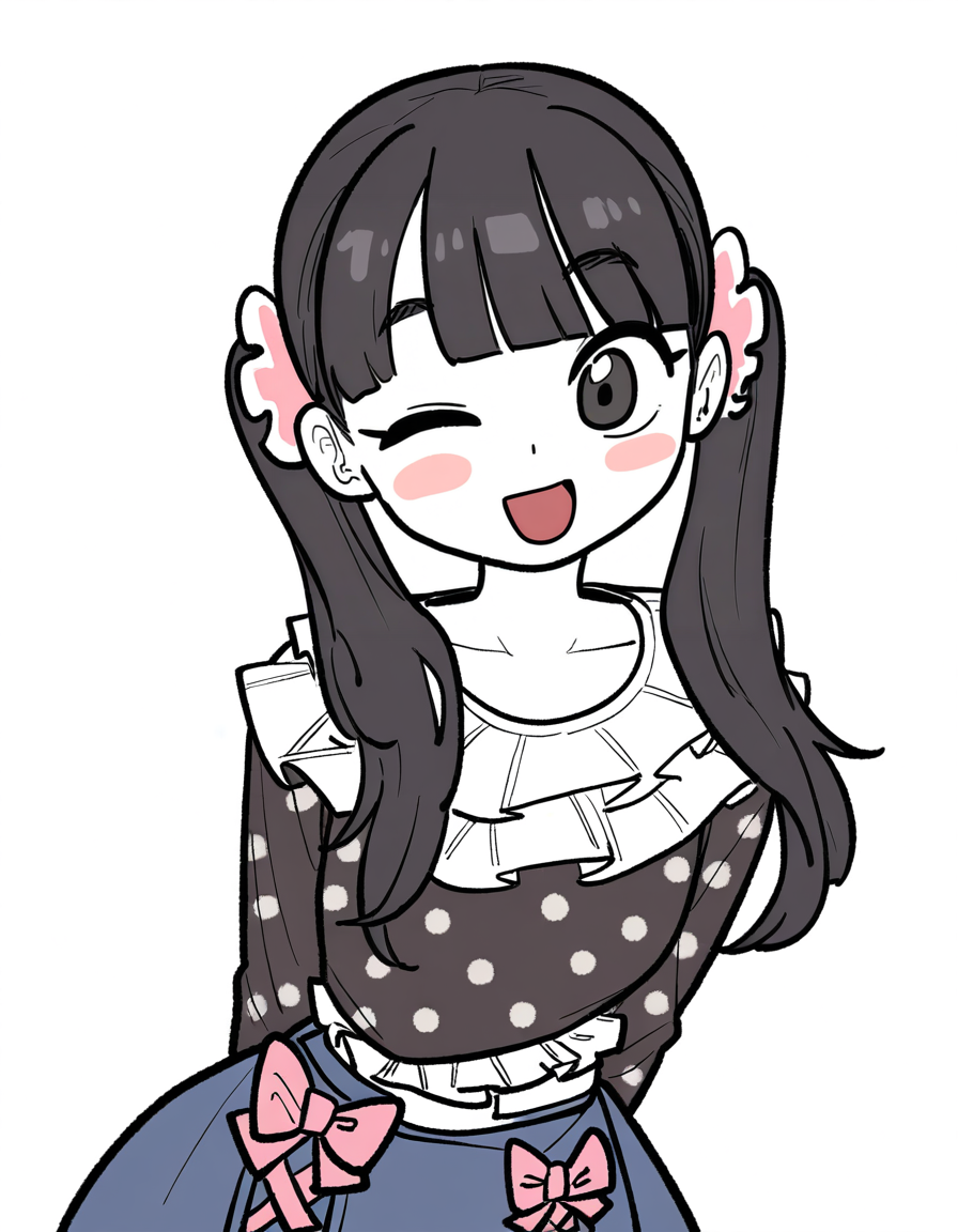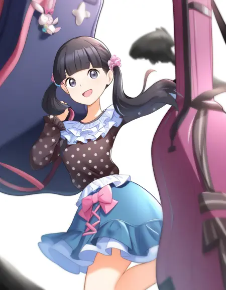 skin1,lijing,1girl,solo,twintails,black hair,black eyes,bangs,hair ornament,polka dot,skirt,frills,