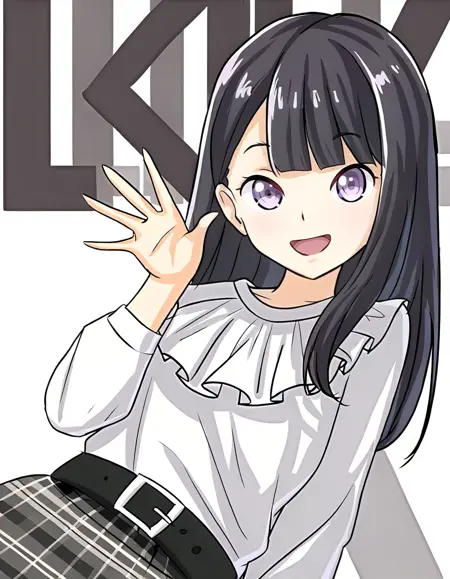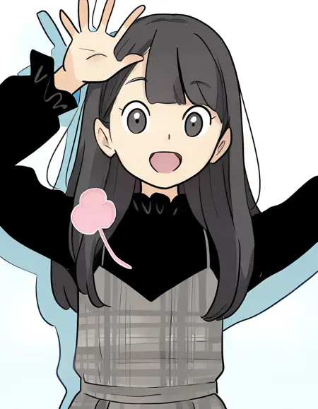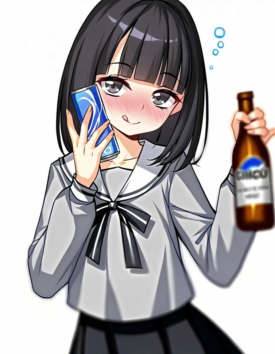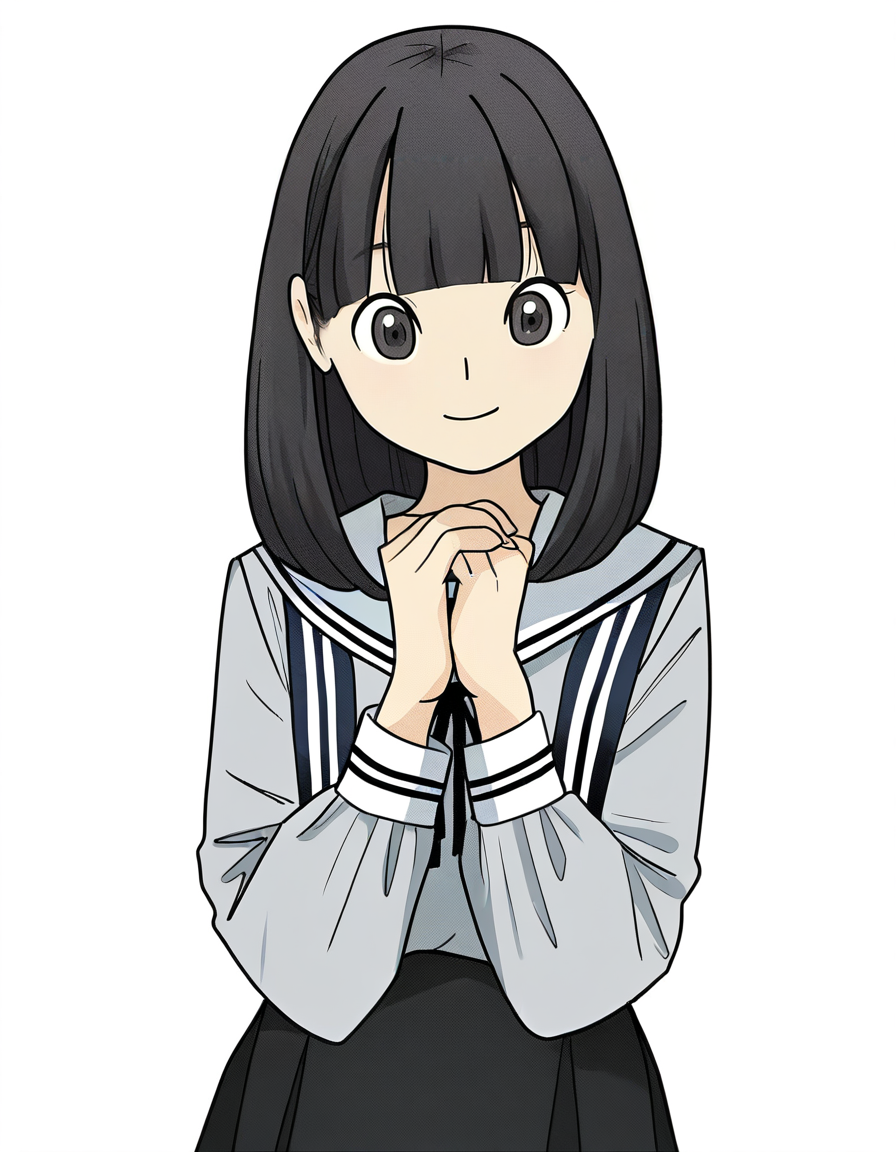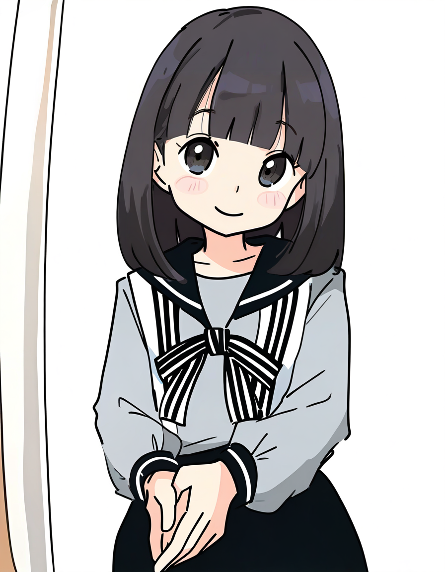 skin2,lijing,1girl,solo,medium hair,black hair,black eyes,blunt bangs,sailor collar,long sleeves,school uniform,serafuku,grey shirt,black skirt,