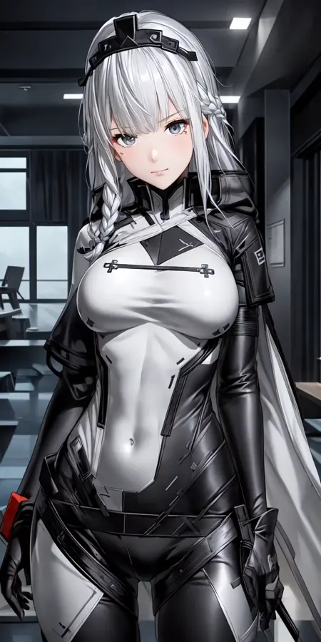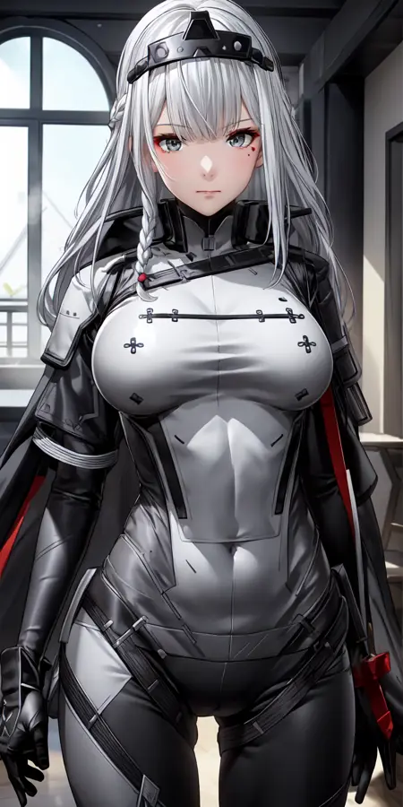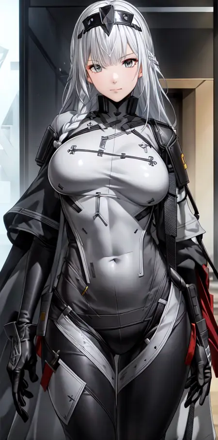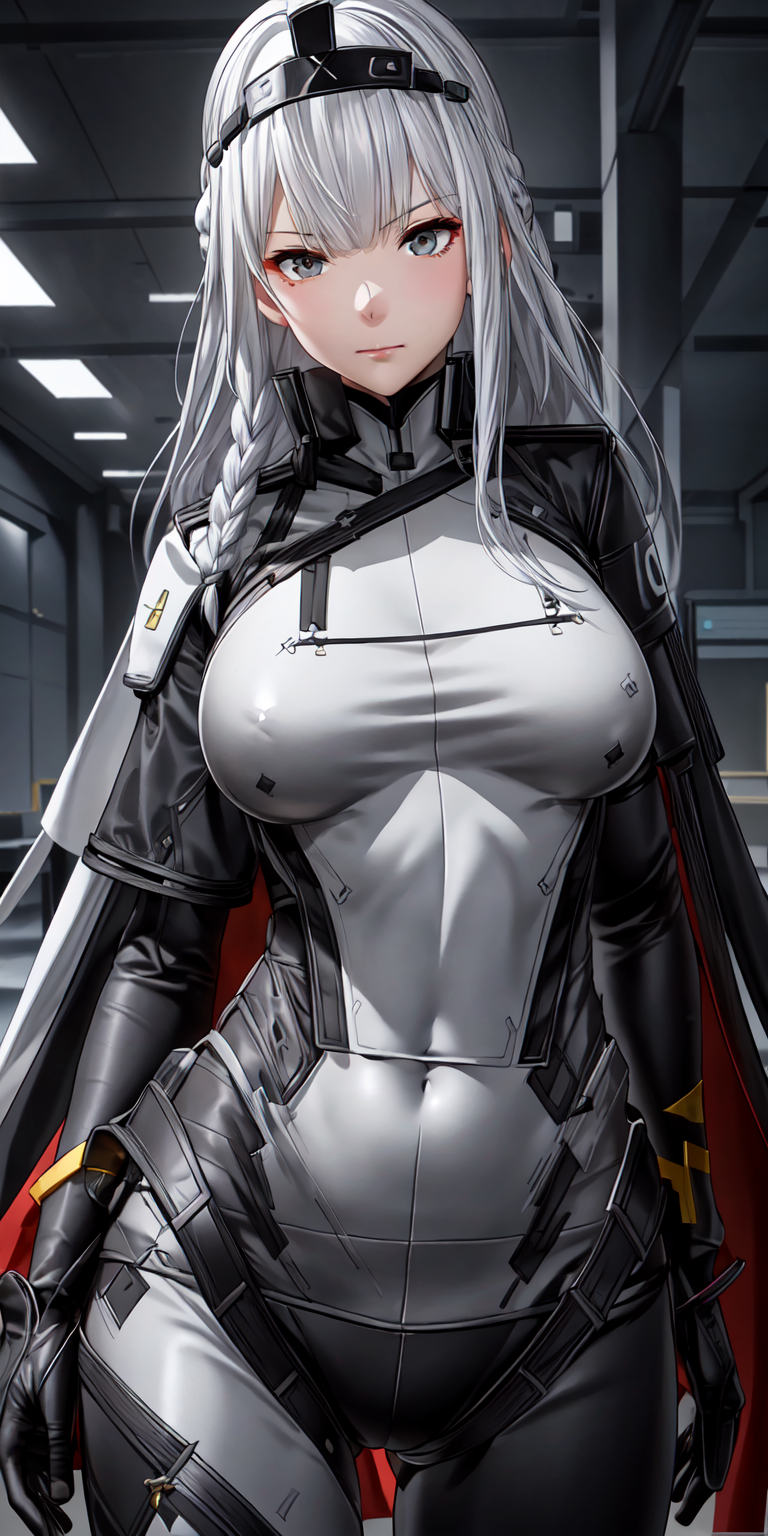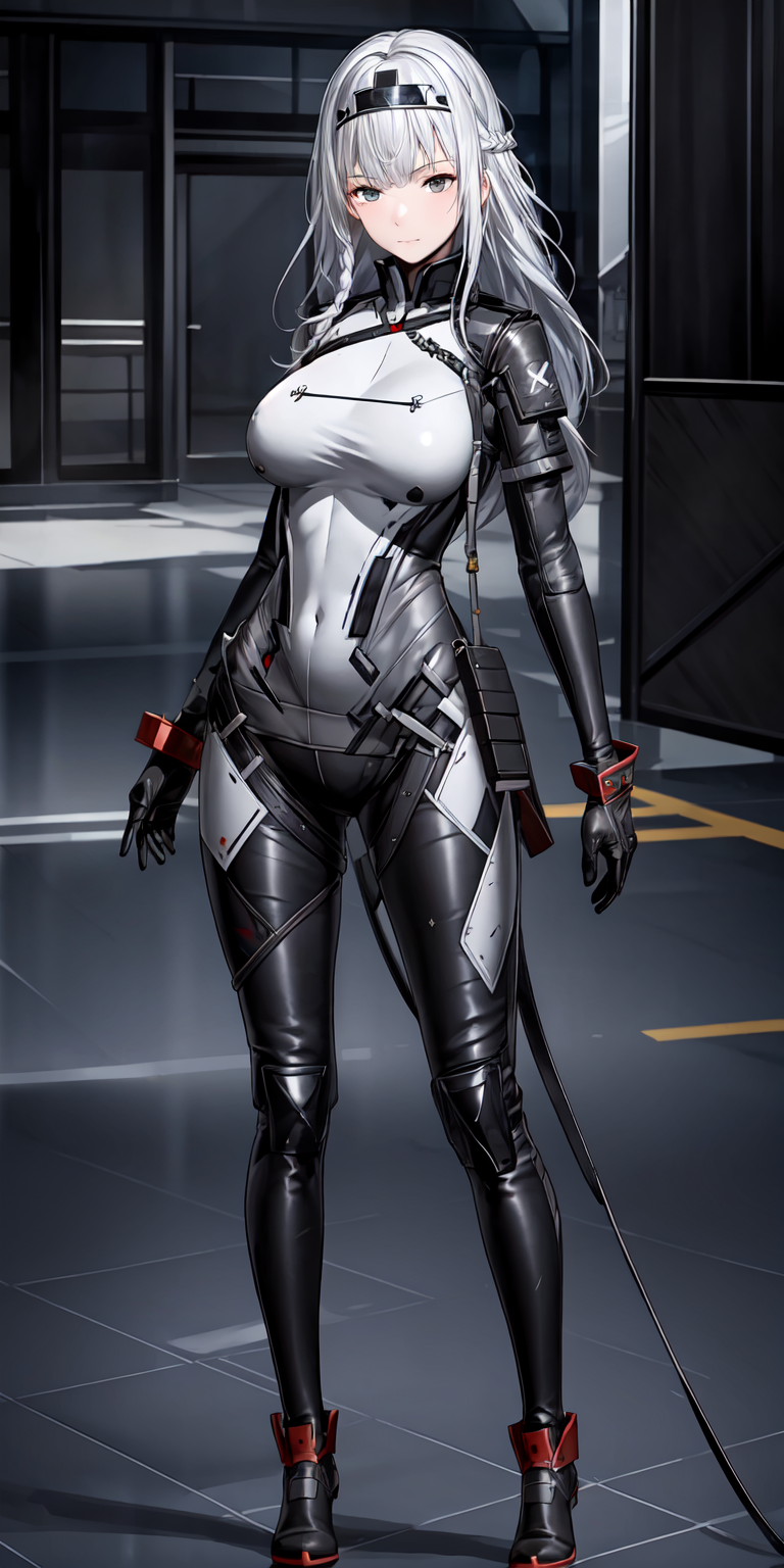 トリガー語: chenxingACB, 1girl, grey eyes, white hair, long hair, braid, bodysuit, gloves, headdress, boots