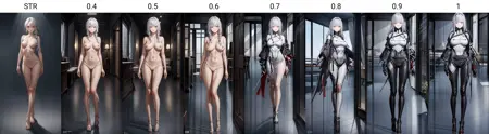 NSFWコンテンツを生成する際は、bodysuit、gloves、headdress、bootsなどの衣装関連プロンプトをネガティブプロンプトに追加することを推奨。