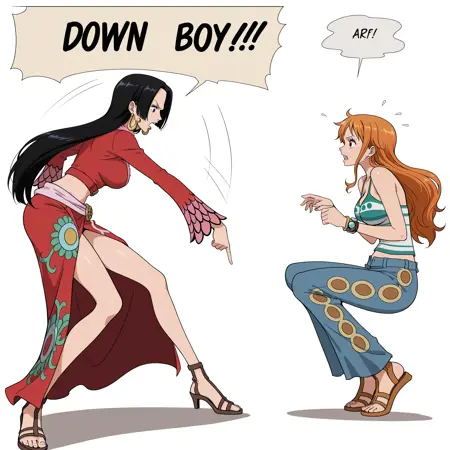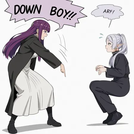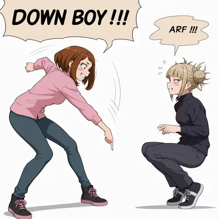 - down boy \(meme\), speech bubble, english text, parody, flying sweatdrops, aggressively pointing downward, commanding stance, dominant expression, crouching, surprised expression, english text, text, small speech bubble, duo, meme,