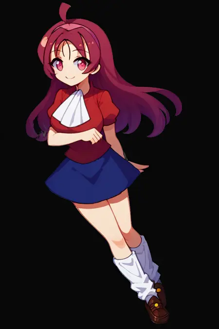 ahoge ,pink eyes,waist-length hair ,long hair,straight hair ,magenta hair ,pink hairband ,parted bangs, {{{solid shirt}}} ,red shirt, puff sleeve,short sleeves, white ascot,long ascot, blue skirt,mini skirt, prairie skirt, white loose socks, loafer