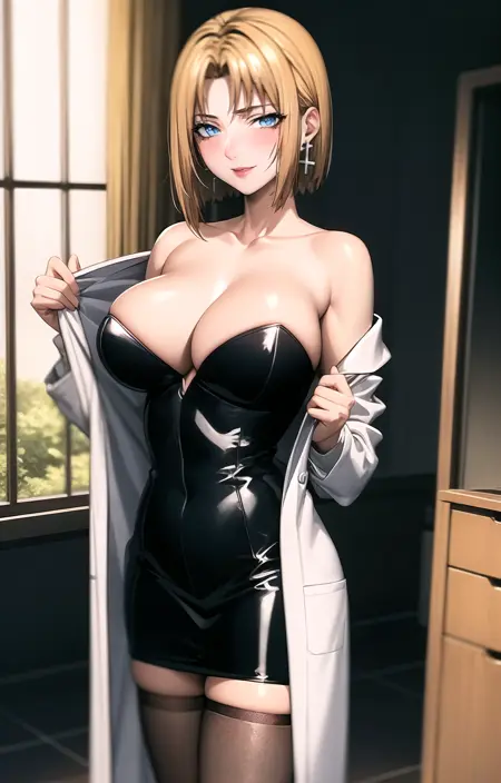 black corset mini dress, white labcoat, black thighhigns, pump shoes (or highheeled boots).