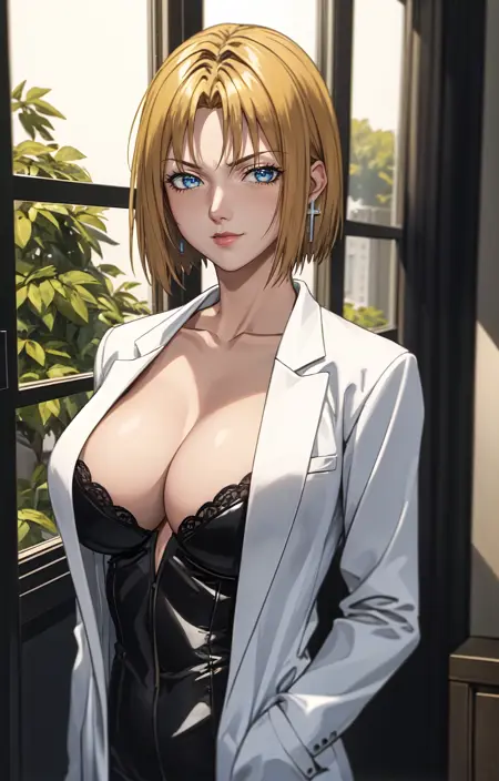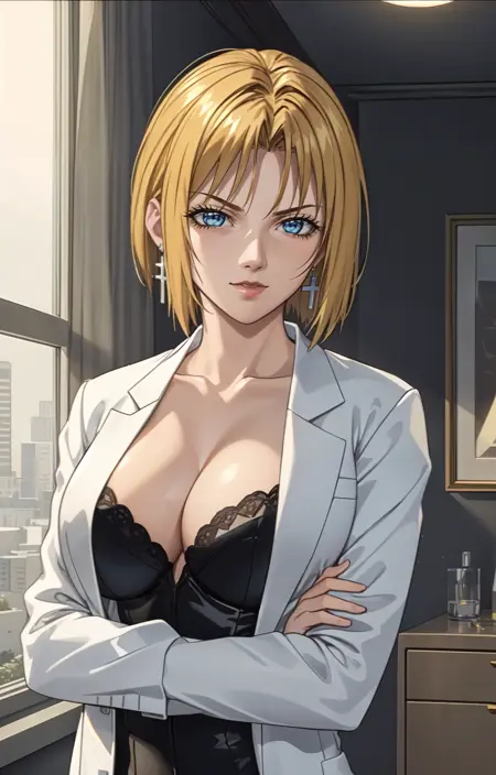 blonde hair, short hair, blue eyes, lipstick, cross earrings,