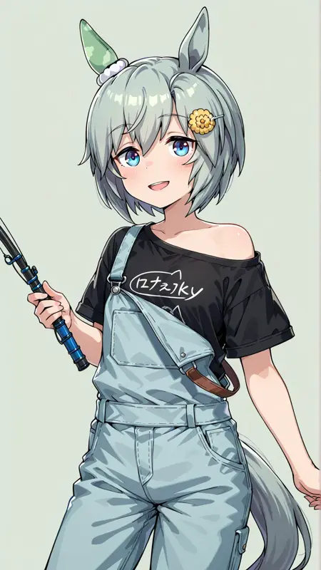 일상복, 한쪽 귀 커버, 머리꽃, 머리핀, 검은색 셔츠, 티셔츠, 옷에 쓰여진 문구, 한쪽 어깨 노출, 짧은 소매, 오버올, 스트랩 바지, 흰색 신발, 스니커즈,