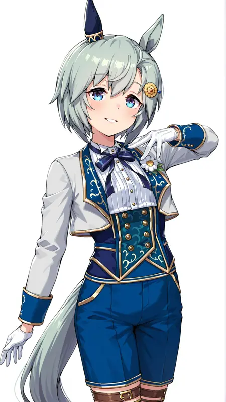 공식 대안 복장, 한쪽 귀 커버, 목 리본, 흰색 재킷, 꽃, 길이 단축된 재킷, 열린 재킷, 긴 소매, 흰색 장갑, 칼라 셔츠, 흰색 셔츠, 파란색 조끼, 단추, 윗가슴, 파란색 바지, 허벅지 스트랩, 다리 끈, 무릎까지 긴 양말, 파란색 신발,