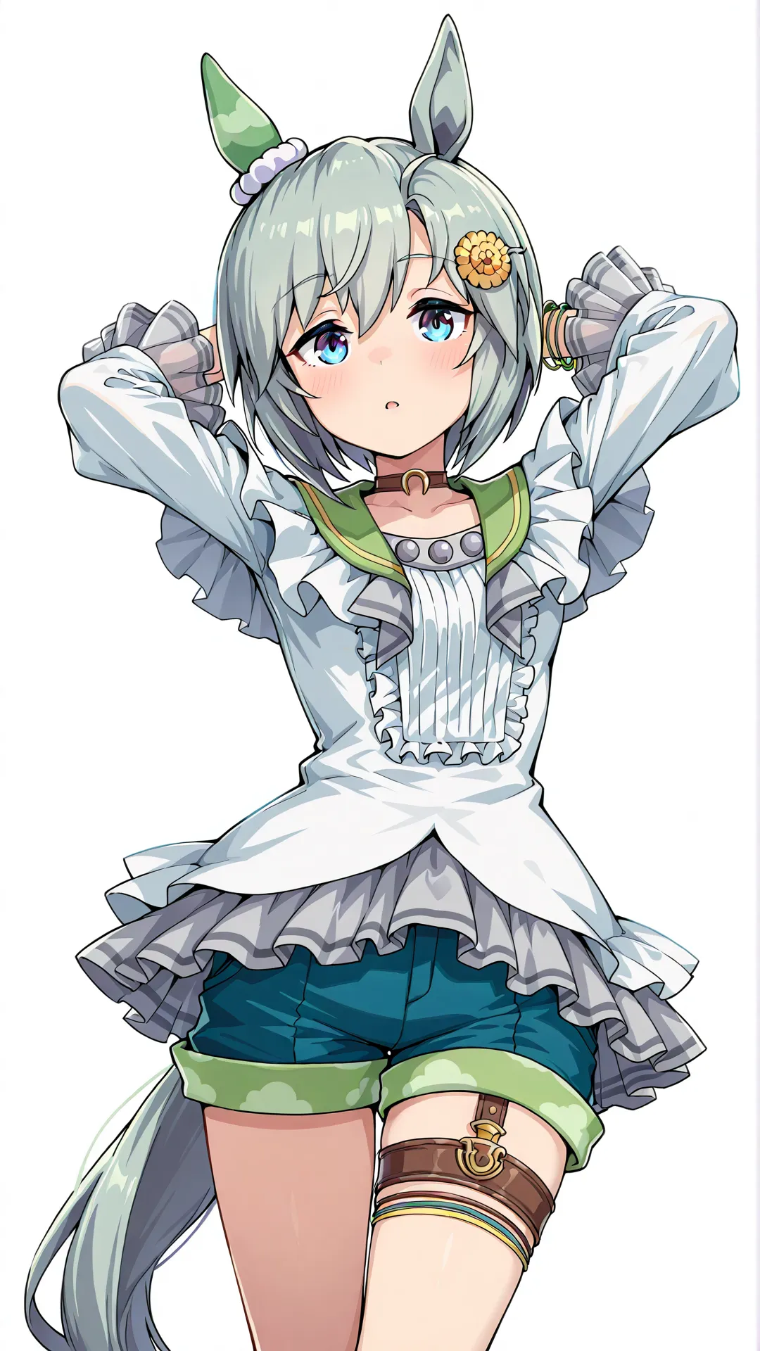 한쪽 귀 커버, 머리꽃, 머리핀, 갈색 목걸이, 녹색 선원 칼라, 흰색 셔츠, 중앙 프릴, 보석, 팔찌, 계층적 소매, 긴 소매 위에 짧은 소매, 넓은 소매, 흰색 드레스, 녹색 반바지, 짧은 반바지, 한쪽 허벅지 스트랩, 모피 트림 부츠, 회색 신발, 하이힐,