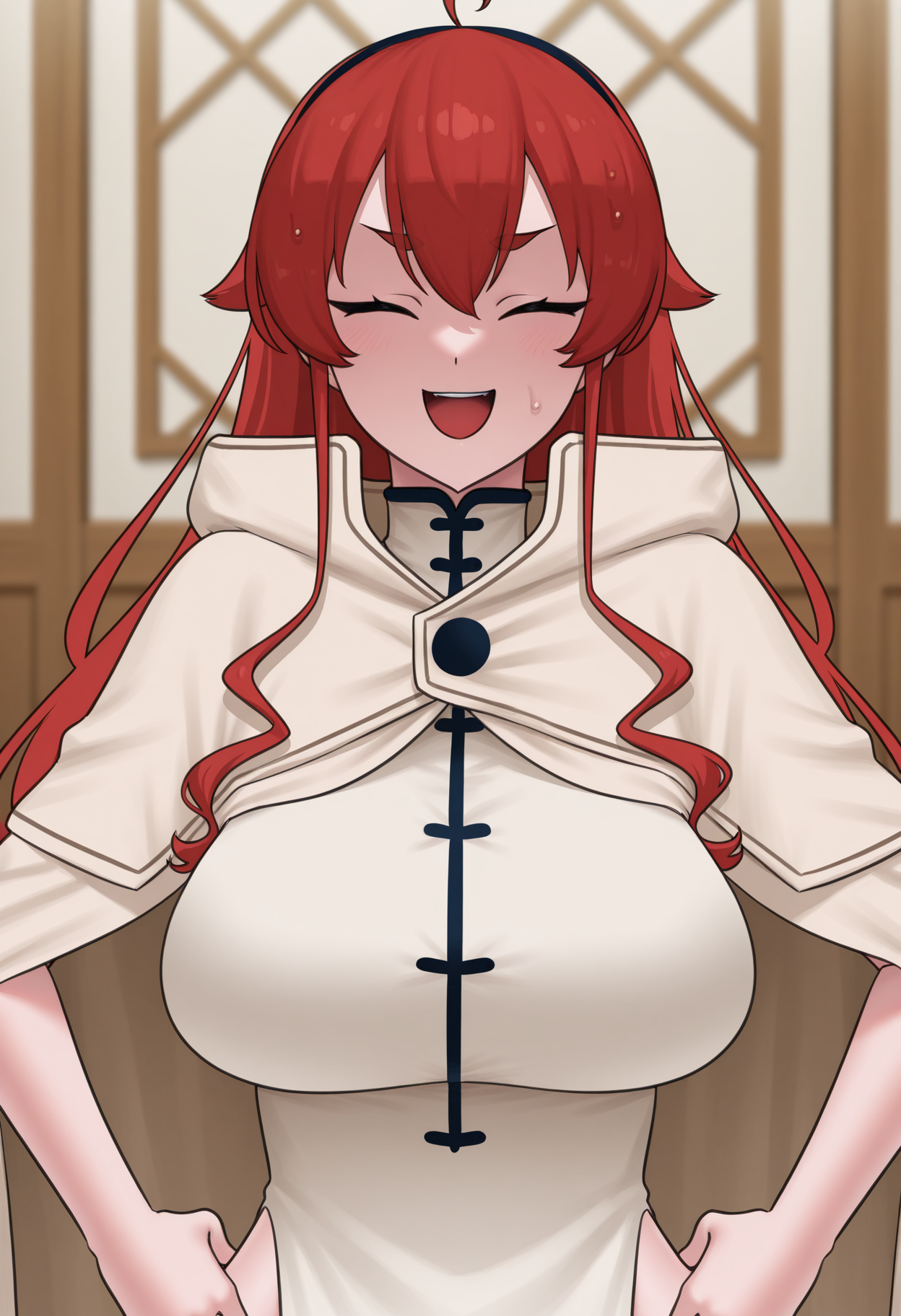 punpunn, 1girl, red eyes, red hair, long hair/hair bun, ahoge, black hairband, white cape, Chinese clothes, white dress, large breasts,