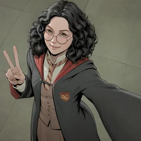 cressida_hl, round eyewear, long hair, black hair, curly hair, hogwarts school uniform