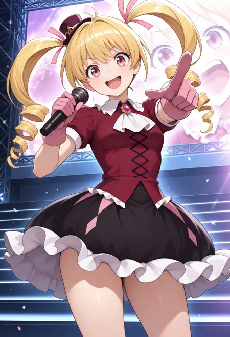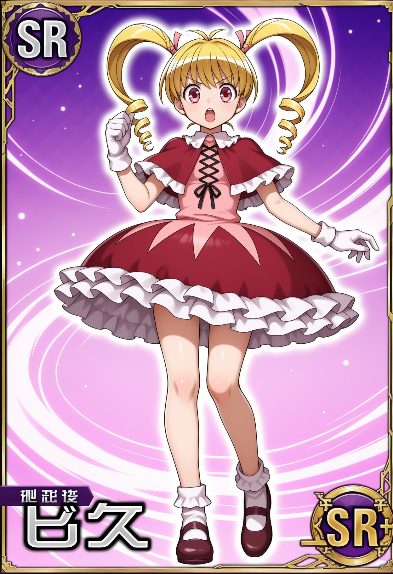 1girl, solo, pink eyes, blonde hair, long hair, drill ponytail, hair ribbon, pink ribbon, red capelet, frilled capelet, multicolored dress, pink dress, red dress, cross-laced top, white gloves, bobby socks, white socks, mary janes, red shoes,