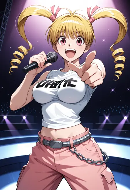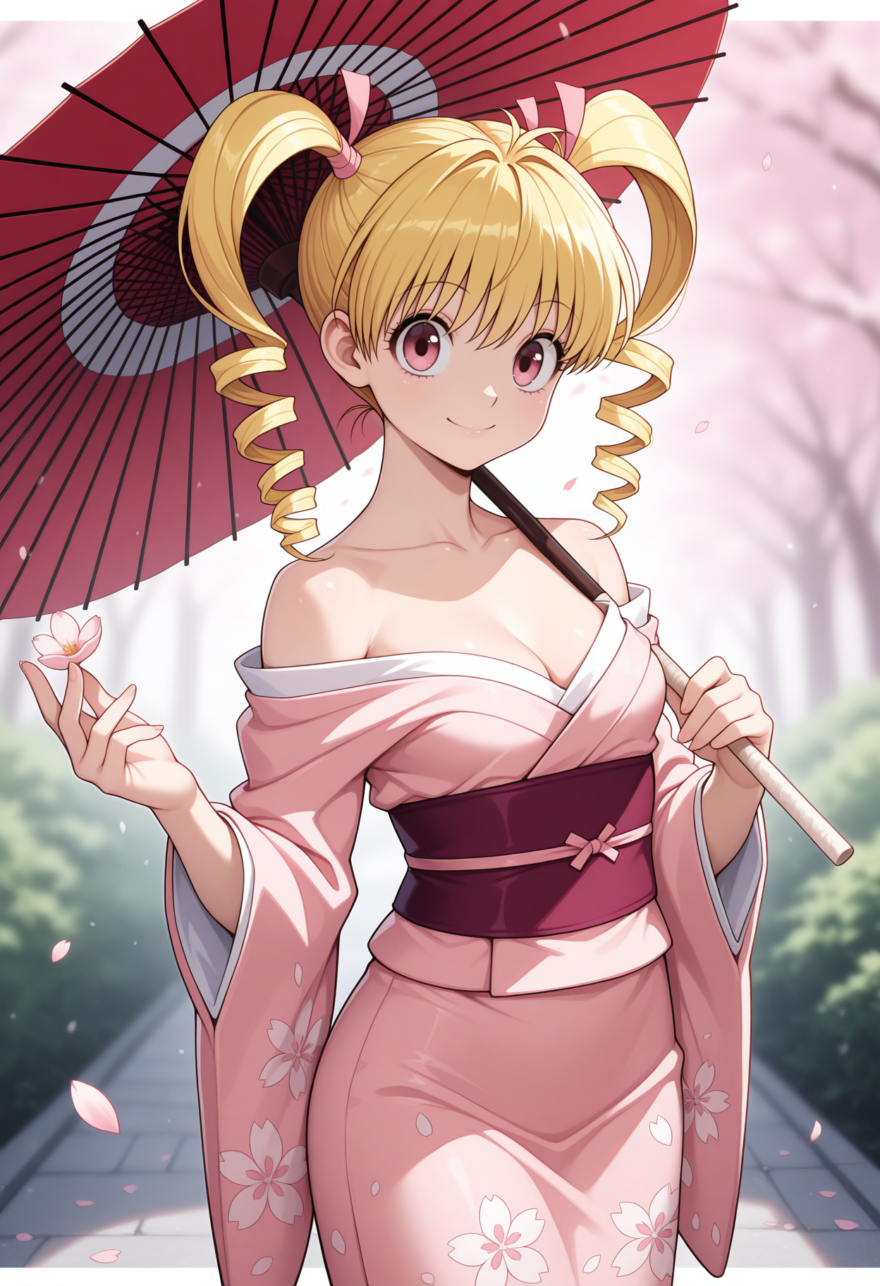 1girl, solo, pink eyes, blonde hair, long hair, drill ponytail,