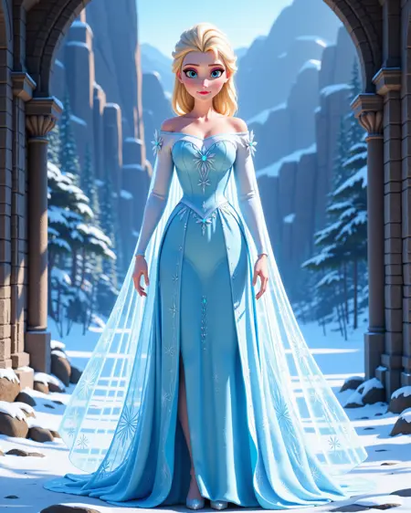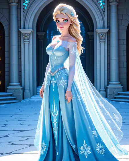엘사의 얼음 궁전 "모두 얼음으로 만들어진 웅장한 궁전으로, 높은 첨탑, 정교한 얼음 조각, 반짝이는 결정체 벽으로 구성되어 있습니다. 빛이 벽을 따라 춤추며 환상적인 색의 색채 무늬를 만듭니다. 내부에는 대형 계단과 아름다운 방들이 엘사의 힘을 반영하며, 얼음 샹들리에와 얼어붙은 창문이 주변의 얼어붙은 야생을 내려다봅니다."