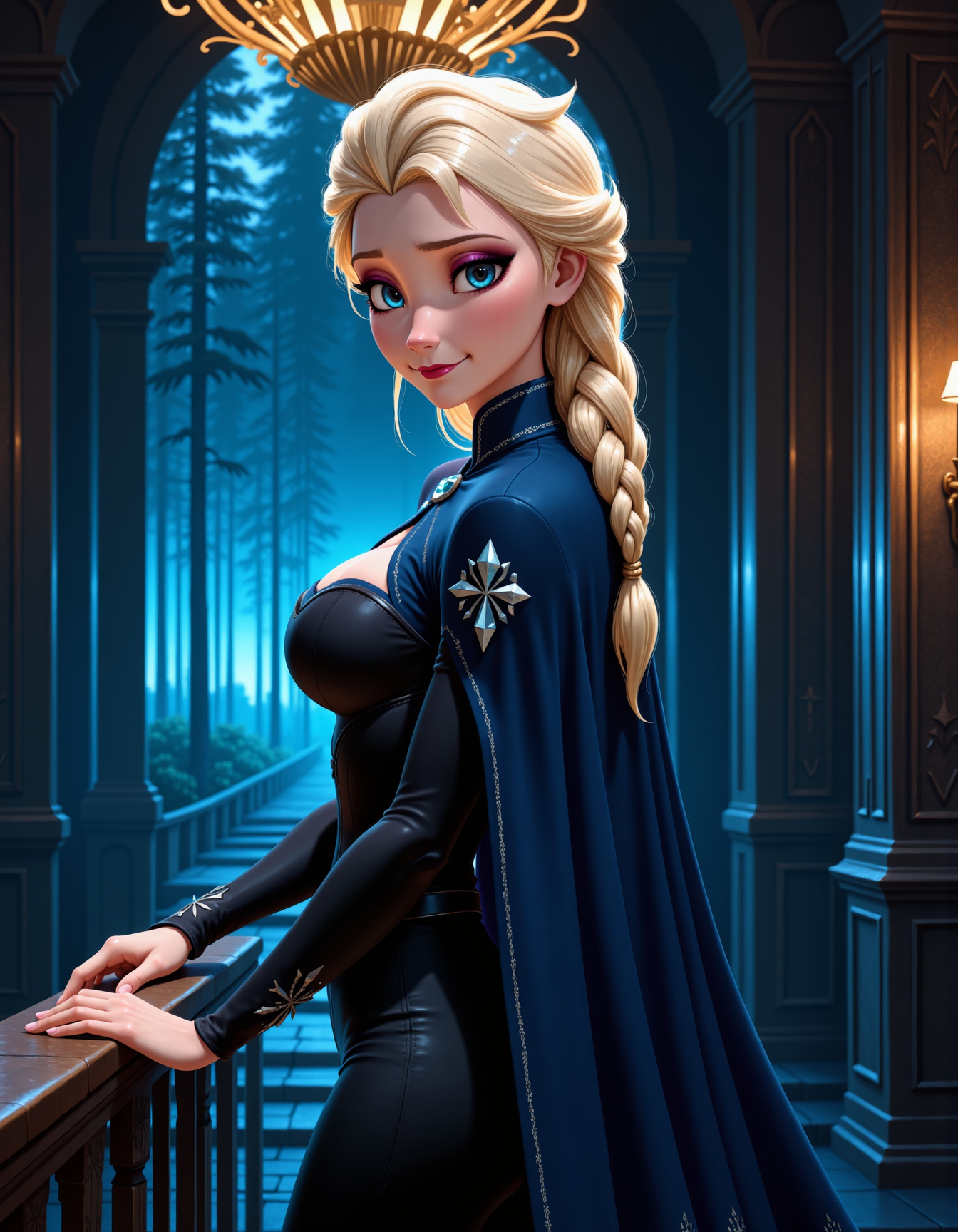 エルサの氷の宮殿「すべて氷で造られた壮麗な宮殿で、高さのある尖塔、精巧な氷の彫刻、きらめく水晶の壁が特徴です。光が壁を照らして、見事なカラフルなカレイドスコープを生み出します。内部には壮大な階段や美しい間が広がり、氷でできたシャンデリアや、周囲の凍った荒野を望む氷の窓が、エルサの力の象徴となっています。」