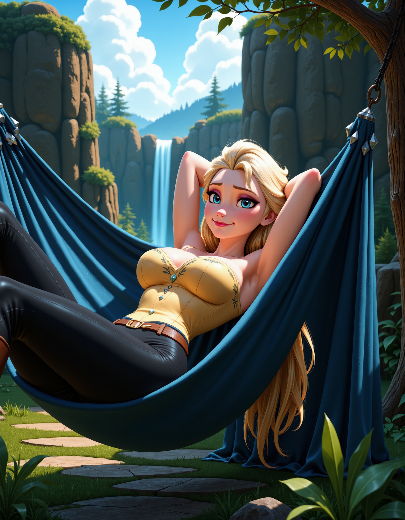 冒険用の服装「複層構造の青色の旅行用服で、襟元と袖に銀の刺繍が施されたフィットしたチュニックを着用。チュニックには黒のレギンスと毛皮で裏打ちされた膝上ブーツを合わせています。背中には、濃いネイビーのマントが軽やかに流れ、肩には氷の結晶のブローチで留められています。髪は半分だけ編み上げられ、顔の周りにゆるやかに垂れ下がっています。」