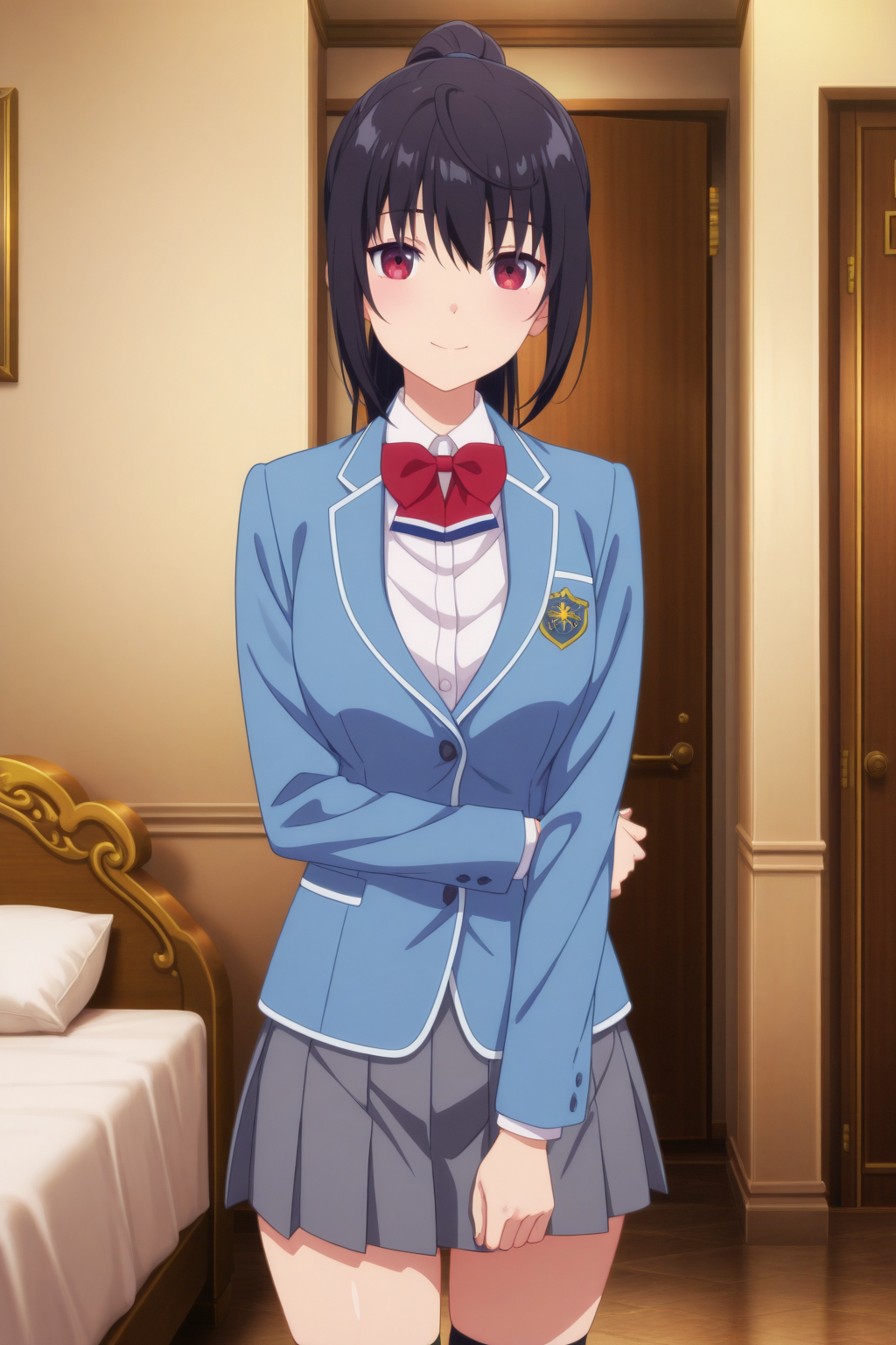 aashizuku, red eyes, black hair, ponytail, school uniform, red bowtie, white shirt, blue blazer, grey skirt, pleated skirt, black kneehighs, anime coloring,
