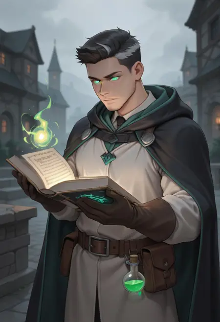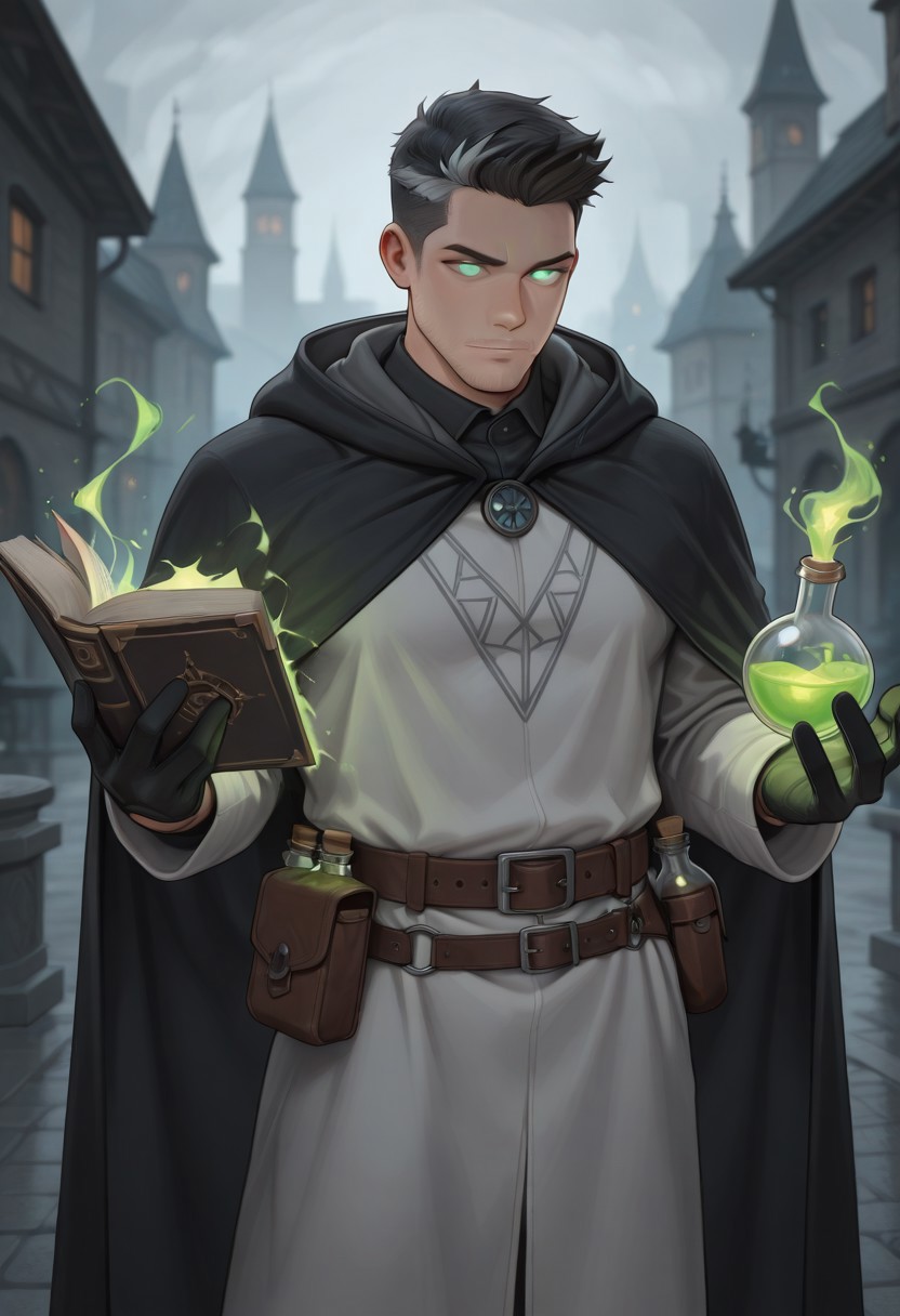 主服装:身穿带帽的白色长袍(绿色民族图案长袍),绿色中世纪衬衫,棕色中世纪长裤,皮鞋,腰带上挂有书籍和药水,