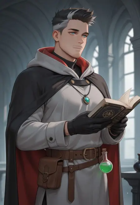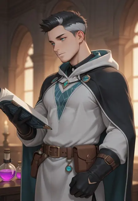 Main costume: wearing a white robe with a hood (green ethnic pattern robe), green medieval shirt, brown medieval pants, leather shoes, tool belt with book and potion,