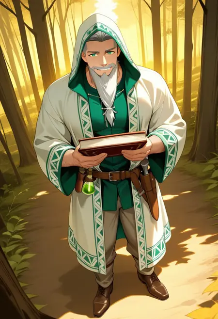 Main costume: wearing a white robe with a hood (green ethnic pattern robe), green medieval shirt, brown medieval pants, leather shoes, tool belt with book and potion,