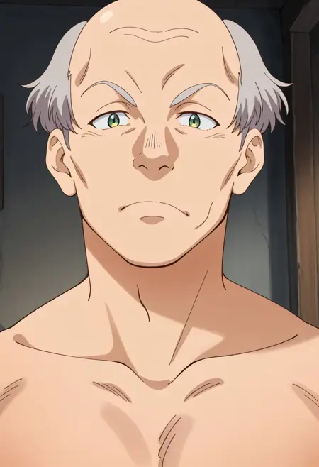 标签: GMotB_CC,绿眼睛,秃顶,成熟男性,灰发,短发,裸露上身,肌肉,棕色长裤,拼接服装,腿部绑带,鞋子,