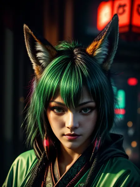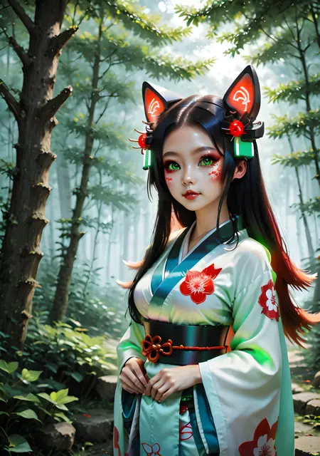 일본 예술은 여우 귀가 있는 미코 성소 소녀를 표현한다