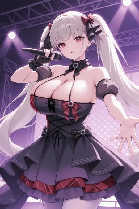 기본 옷차림: 쌍머리, 머리 리본, 이색 리본, 검은 리본, 흰 리본, 분리된 칼라, 이색 칼라, 검은 칼라, 흰 칼라, 어깨 노출, 긴 드레스, 이색 드레스, 검은 드레스, 흰 드레스, 프릴, 흰 넥타이, 가슴 사이 넥타이, 젖가슴, 아랫가슴, 흰 허벅지 양말, 검은 웨딩 장갑