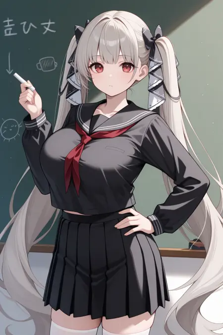 사랑하는 이의 심장은 근무 중에 뛴다: 쌍머리, 머리 리본, 이색 리본, 검은 리본, 흰 리본, 검은 세라ฟ쿠, 빨간 넥커치프, 검은 주름 치마, 흰 허벅지 양말