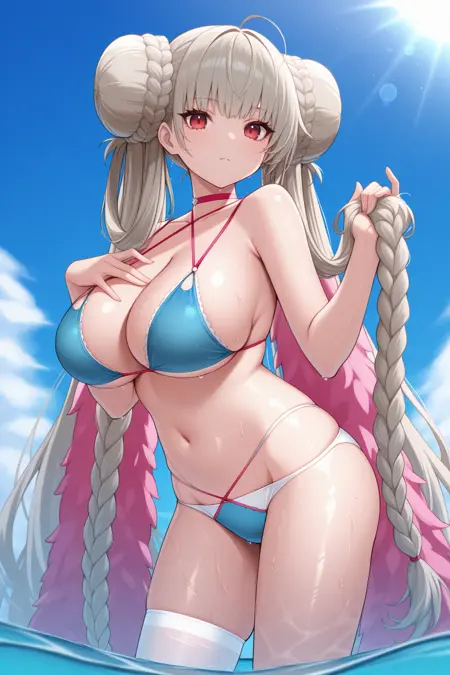 해변의 여인: 더블 부, 땋은 부, 쌍 땋은 머리, 아호게, 분홍 색 초콜릿, 깃털 스카프, 파란 비키니, 스트링 비키니, 십자형 홀터, 다중 스트랩 비키니 상의, 다중 스트랩 비키니 하의, 단일 허벅지 양말, 흰 허벅지 양말
