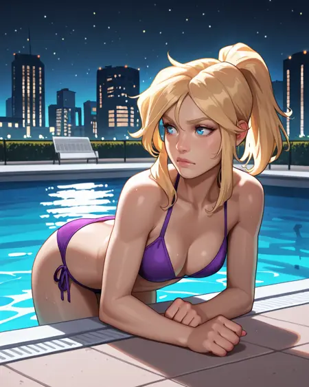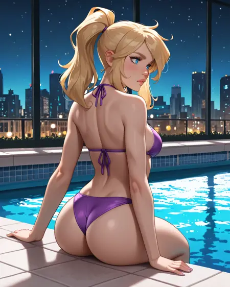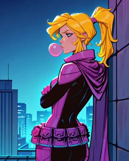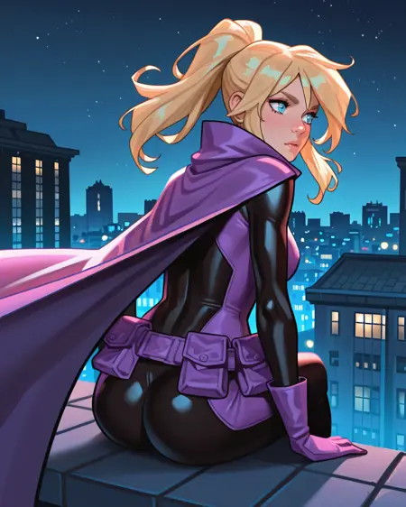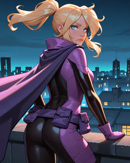 トリガー:stephaniebrown, ブロンドの髪, ソロ, ボディスーツ, マウスマスク, ケープ, フッド, グローブ, ベルト, 青い目, ベルトポーチ