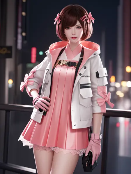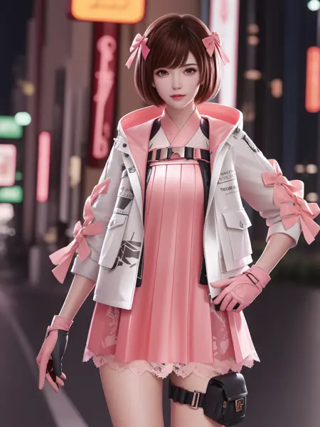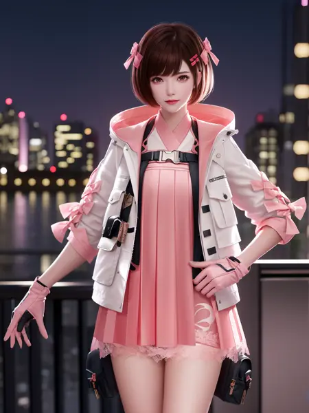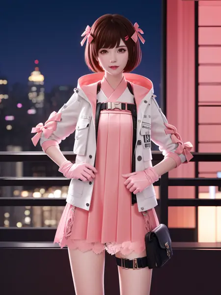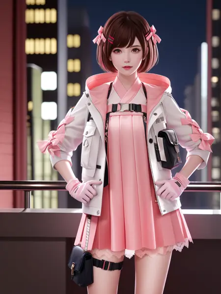 • CFguanxiaoyuQF, 1girl, solo, gloves, brown hair, short hair, pink dress, brown eyes, jacket, looking at viewer, hairclip, hair bow, thigh holster, lace, short dress, belt, lips, bangs, cityscape, night, mature female, hand on hip,