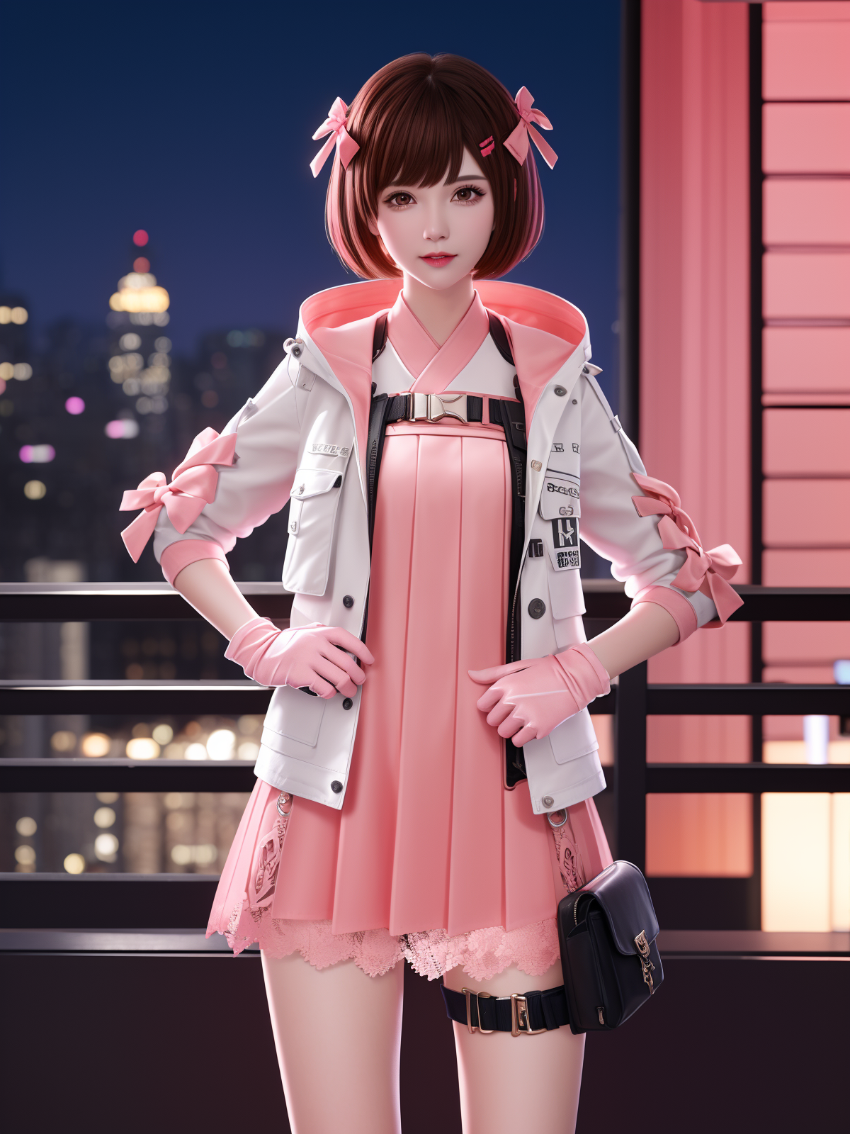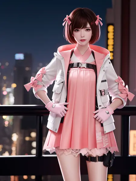 - CFguanxiaoyuQF, 1girl, solo, gloves, brown hair,short hair, pink dress, brown eyes, jacket,looking at viewer, hairclip, hair bow, thigh holster, lace, short dress, belt, lips, bangs, cityscape, night, mature female, hand on hip,