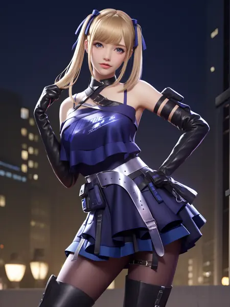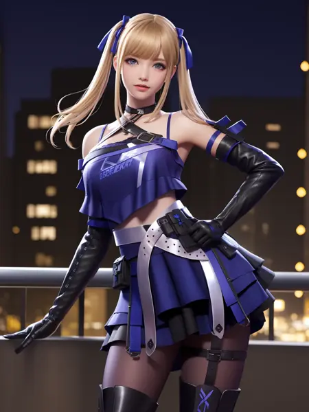 - CFqingyaBW, 1girl, elbow gloves, solo,lace-up boots, blue eyes, blonde hair, pantyhose, twintails,skirt,choker, bare shoulders, bangs,crop top,hair ribbon,belt, mature female, cityscape, night, looking at viewer,