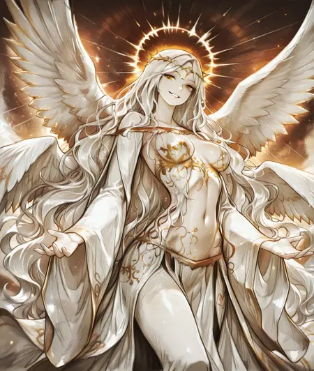 天使形態: angel-form、複数の翼、白い肌、天使、ハロー、羽の翼、浮遊、天使の翼。