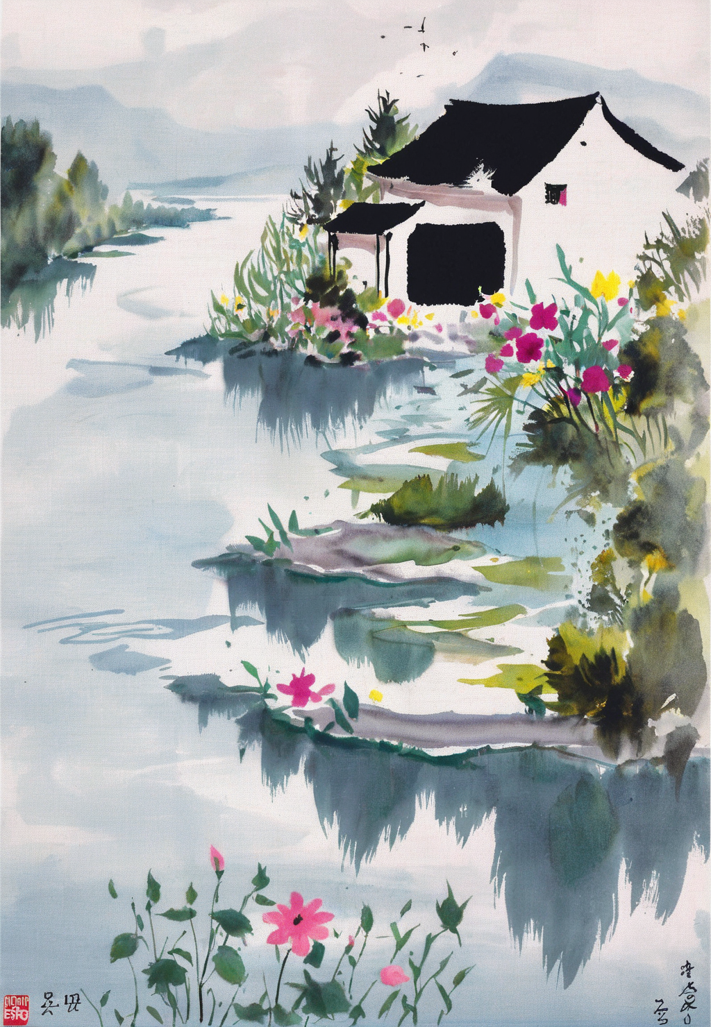 관련 프롬프트: house, river, white wall, boat, flower 등;