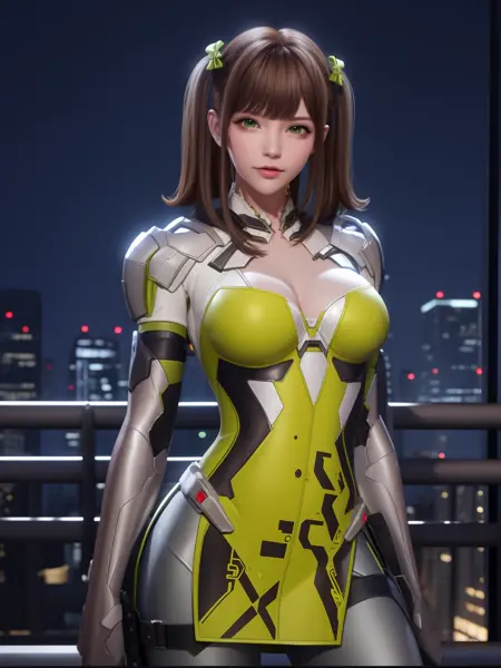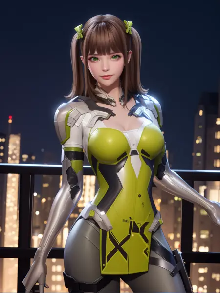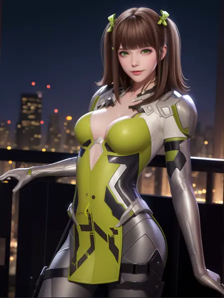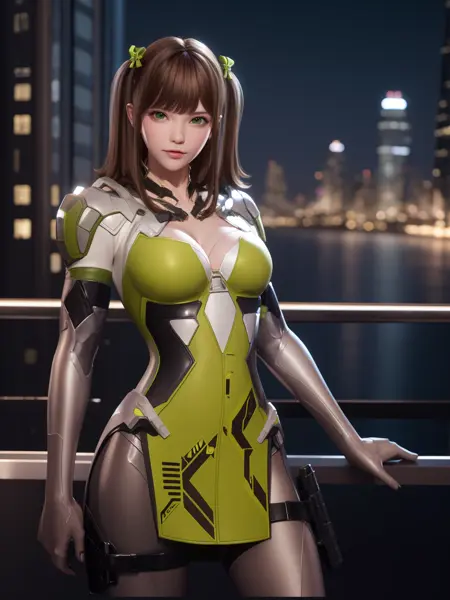 - CFqingyaLHWZ, 1girl, solo, brown hair, green eyes, breasts, bodysuit,looking at viewer, lips, medium breasts, twintails, bangs,thigh holster,hair bow, cityscape, night, mature female,