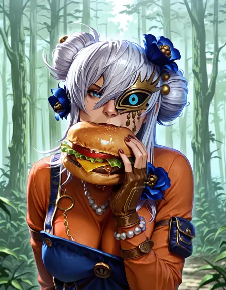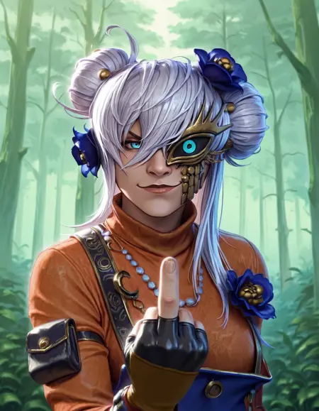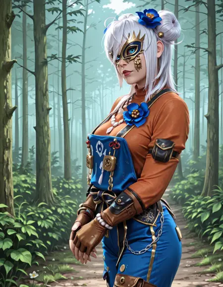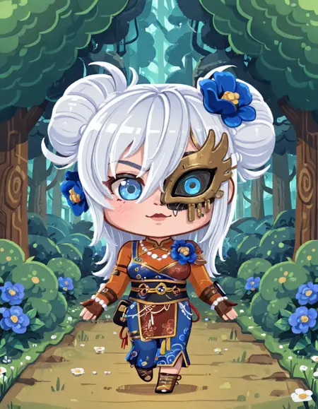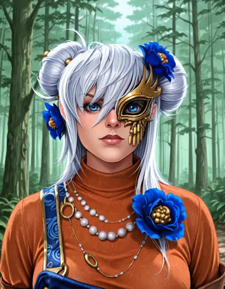 1girl, solo, double bun, flower, white hair, hair ornament, hair bun, long hair, mask, blue eyes, hair flower, tryks,
