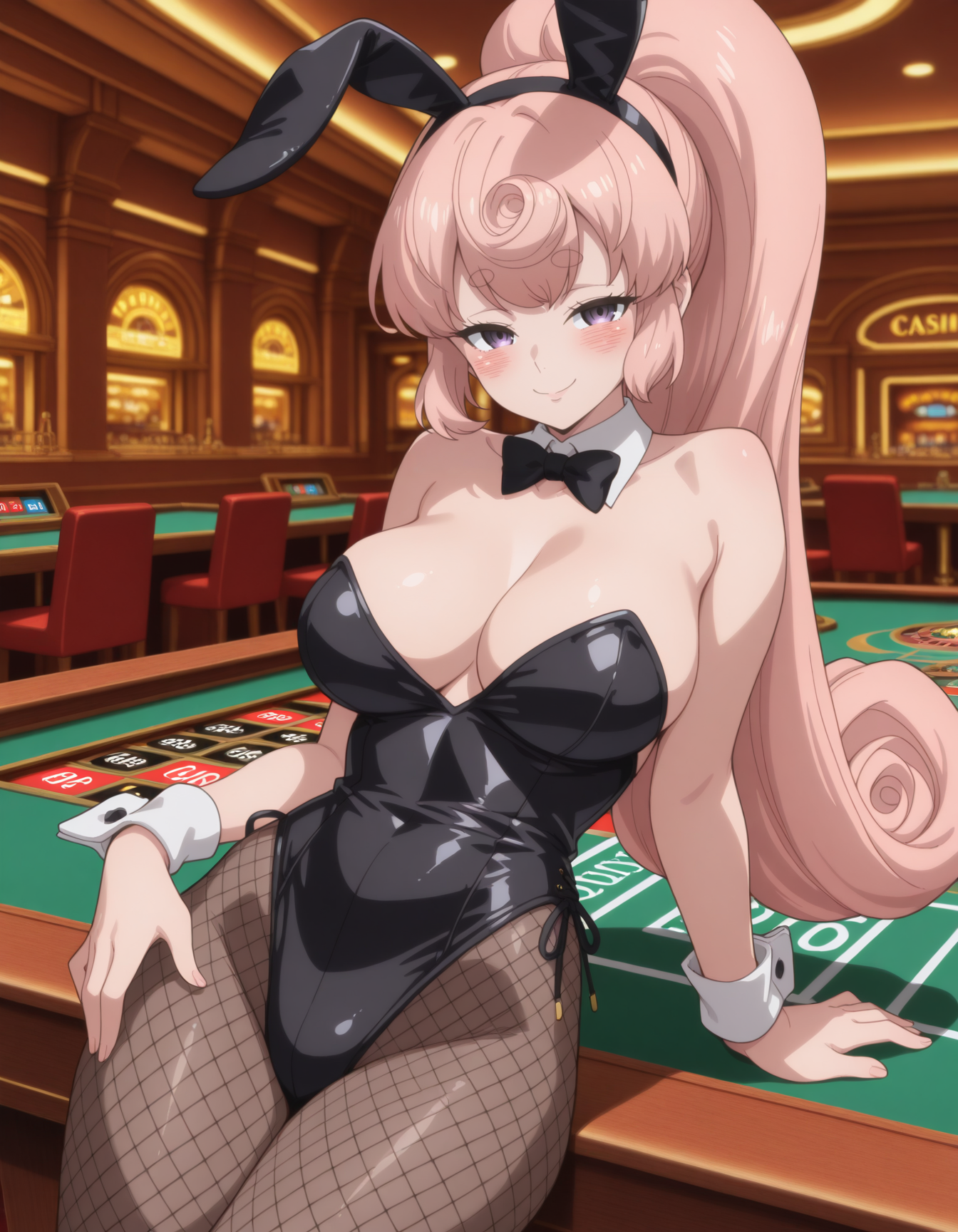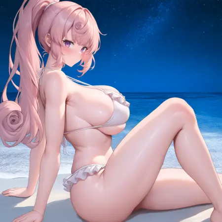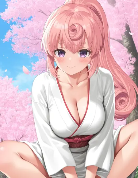 claudia, 1girl, pink hair, ponytail, curly hair, thick eyebrows, purple eyes