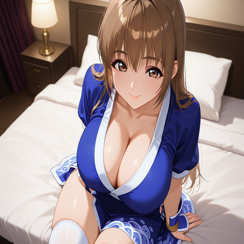 Kasumi: kasumi, brown hair, long hair, brown eyes, blue outfit, chevage, white thighhighs,