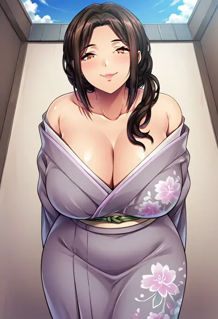 (( lora:arakawa\_sayako:1 , arakawa_sayako, beautiful amber eyes, clear eyes, bright pupils, piercing eyes, beautiful dark brown hair, beautiful low bun hairstyle, hair over shoulder, very huge and shaggy breast, normal waist, wide hips, beautiful skin, sexy beauty, extraordinary beautiful woman, attractive woman, super sexy woman, lustful body, sexy woman with seductive obscene body, sensual body, voluptuous body, sexy milf, sexy mature woman, )) ,