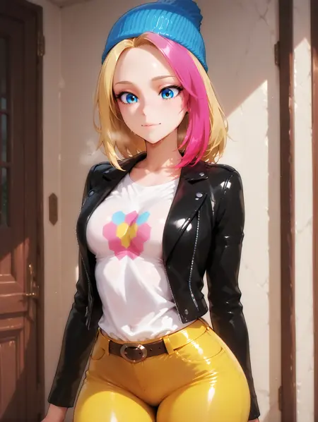 服装提示词:皮夹克、黑色夹克、帽子、白衬衫、黄裤子、腰带、蓝色头饰、针织帽