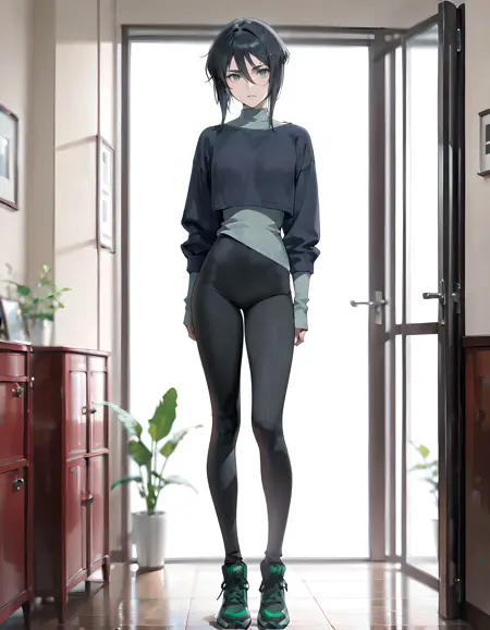 基础提示:L4ur13, 1girl, 短发, 发丝遮眼, 绿眼, 浓眉, 眉毛穿孔, 黑发