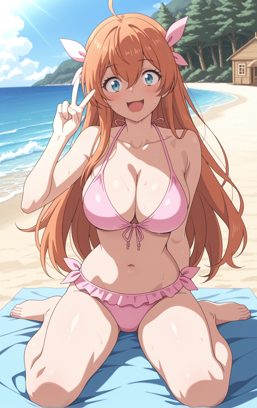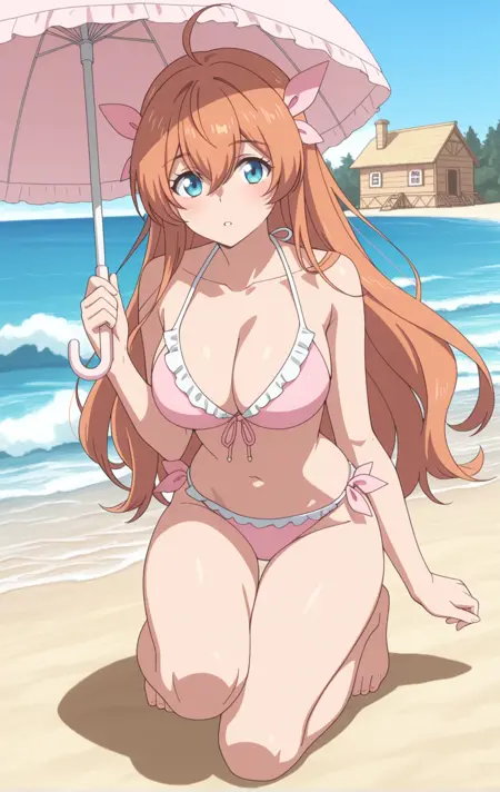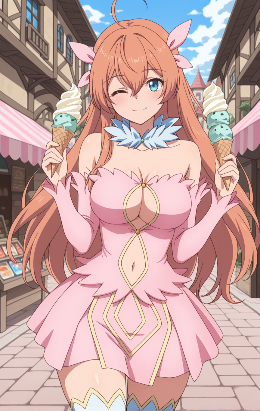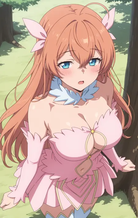 1girl,skss4ephan1ean1m,anime coloring,solo,long hair, hair between eyes, brown hair, orange hair, blue eyes, ahoge,(large breasts:0.8), pink ribbon, thighhighs, pink dress, navel, white thighhighs , detached sleeves, pink sleeves,detached collar,bare shoulders,smile,looking at viewer,best quality,masterpiece,sensitive , lora:SokushiCheatStephanieNoobAI:0.95