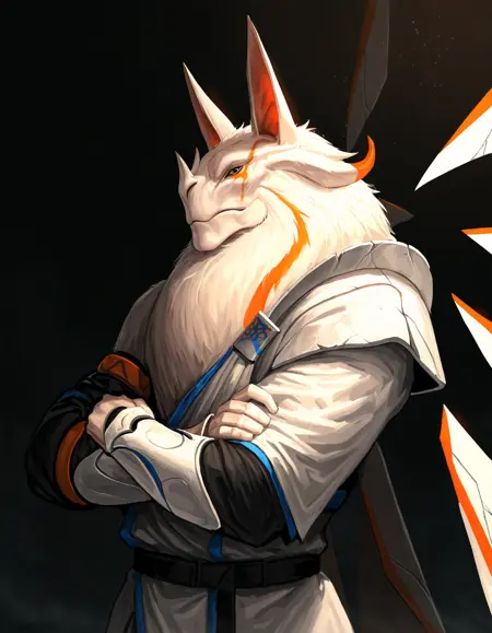 Allayi, no humans, white fur, orange markings, detached wings, robe, armor,