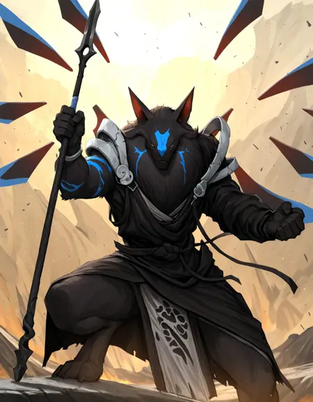 Allayi, no humans, black fur, blue markings, detached wings, robe, armor,