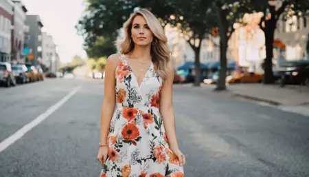 half body headshot photo by Melissa Stemmer, young woman, looking at viewer, freckles, long brunette hair, wearing a blue tank top, cleavage, necklace, holding a pink flower, golden hour lighting, bokeh, blurry background