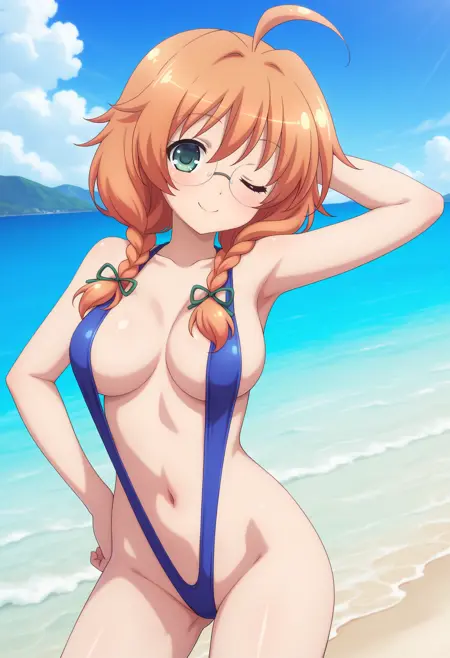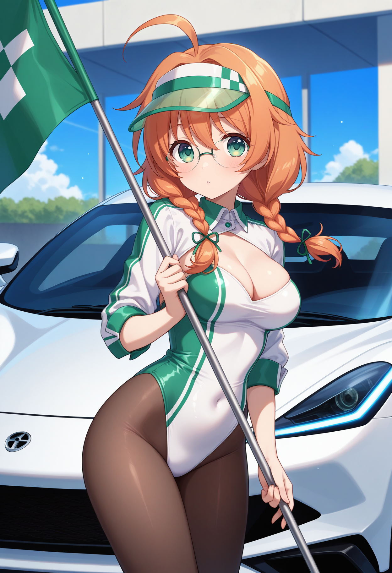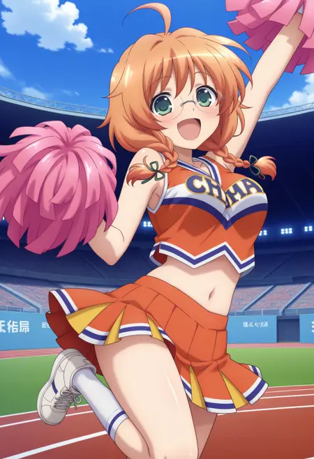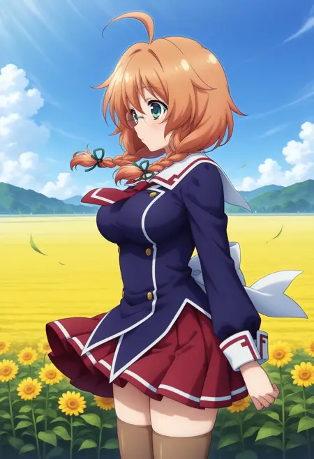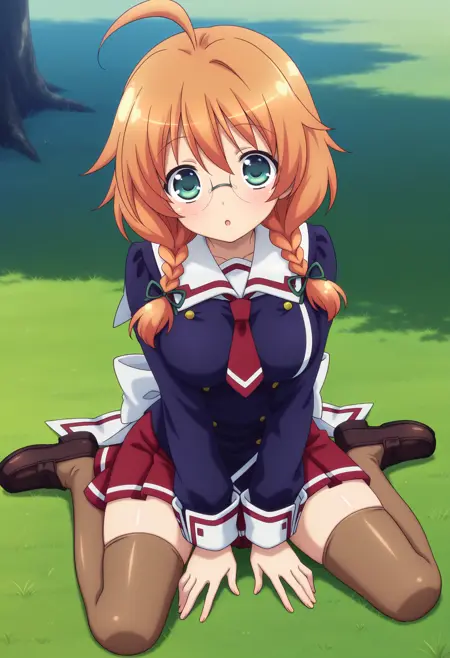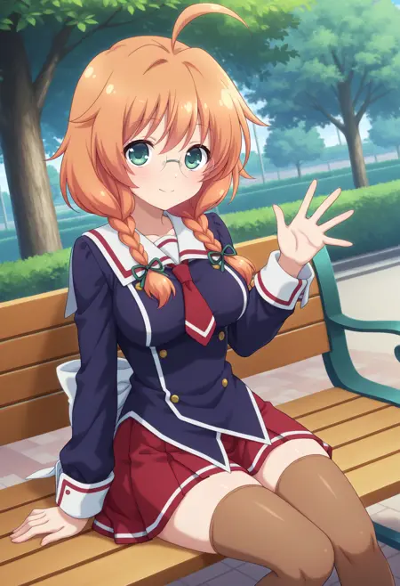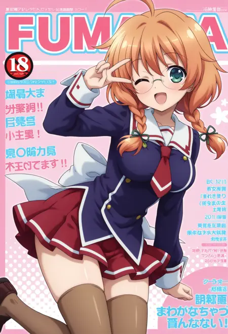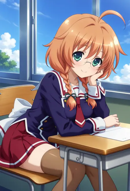 outfit1aakonoha, orange hair, ahoge, twin braids, hair ribbon, glasses, green eyes, breasts, school uniform, white sailor collar, red necktie, blue jacket, long sleeves, back bow, white bow, red skirt, brown thighhighs