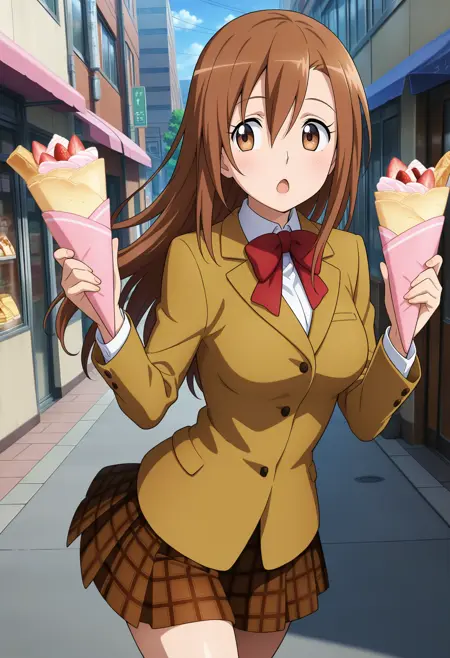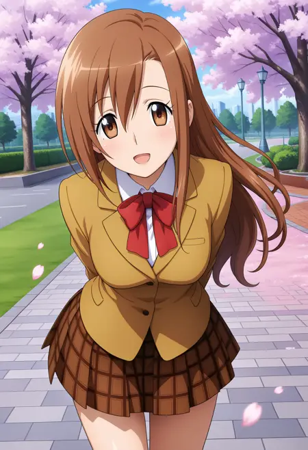 outfit1aaaria, long hair, brown hair, brown eyes, medium breasts, school uniform, red bowtie, blazer, brown jacket, long sleeves, pleated skirt, plaid skirt, brown skirt