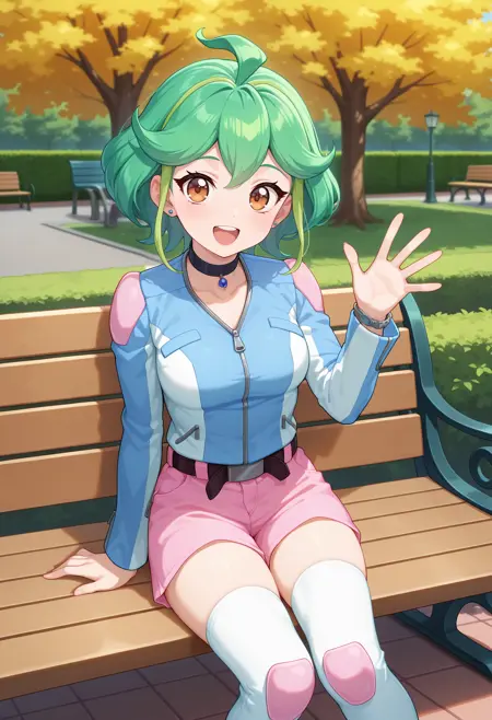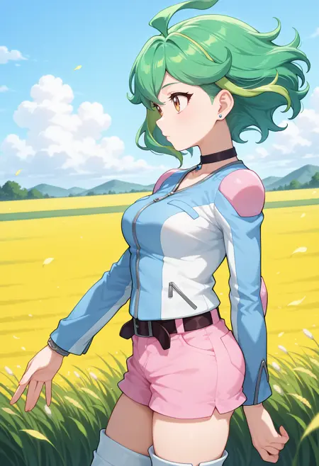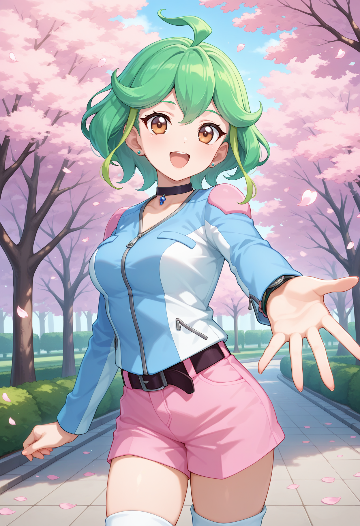 outfit1aarin, 단발, 다색 머리, 녹색 머리, ahoge, 귀걸이, 갈색 눈, 가슴, 검은 목걸이, 파란 재킷, 긴 소매, 벨트, 분홍색 반바지, 흰색 허벅지 양말