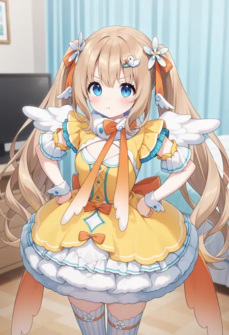 outfit1aaahiru, long hair, light brown hair, twintails, hair ribbon, hair flower, wing hair ornament, duck hair ornament, blue eyes, wings, small breasts, orange bowtie, yellow dress, short sleeves, detached sleeves, wrist cuffs, striped thighhighs